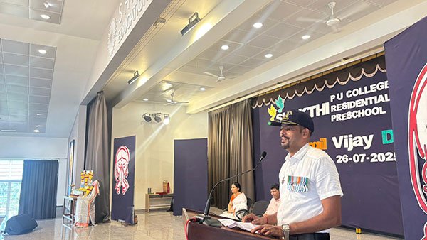ವಿದ್ಯಾರ್ಥಿಗಳನ್ನುದ್ದೇಶಿಸಿ ಮಾತನಾಡಿದ ಇವರು ಕಾರ್ಗಿಲ್ ಯುದ್ಧದಲ್ಲಿ ತಾವು ಭಾಗವಹಿಸಿದ ನೆನಪುಗಳನ್ನು ಹಂಚಿಕೊಂಡರು. ಬದುಕಿನಲ್ಲಿ ಹೀರೋ ಆಗಬೇಕೆಂದರೆ ಸೈನಿಕರಾಗಿ. ಸೈನಿಕರೇ ನಿಜವಾದ ಹೀರೋಗಳು. ಸೈನ್ಯದಲ್ಲಿರುವವರಿಗೆ ತಂದೆ, ತಾಯಿ, ಗೆಳೆಯ ಅನ್ನುವ ಸಂಬಂಧಕ್ಕಿಂತಲೂ ಸೈನಿಕರ ಸಮವಸ್ತ್ರದ ಮೇಲೆ ಅತೀವವಾದ ಭಾವನಾತ್ಮಕ ಸಂಬಂಧವಿರುತ್ತದೆ. ಭಾರತದ ಯಾವುದೇ ಒಬ್ಬ ಸೈನಿಕನಿಗೆ ಏನೇ ಆದರೂ ಇತರ ಸೈನಿಕರು ಕೆಚ್ಚೆದೆಯಿಂದ ಪ್ರತಿಭಟಿಸುತ್ತಾರೆ, ಎದುರಾಳಿಗಳೊಂದಿಗೆ ಹೋರಾಡುತ್ತಾರೆ. ದೇಶಭಕ್ತಿಗೆ ಇನ್ನೊಂದು ಹೆಸರೇ ಸೈನಿಕ ಎಂದು ಹೇಳಿದರು. ಇದು ಭಾರತದ ಸೈನ್ಯ ಕಲಿಸಿಕೊಡುವ ಮೌಲ್ಯ. ಹಾಗಾಗಿ ಸೈನ್ಯ ಸೇರುವುದೇ ಇತರ ಎಲ್ಲಾ ಉದ್ಯೋಗಗಳಿಂದ ಶ್ರೇಷ್ಠವಾದ ಉದ್ಯೋಗ ಎಂದು ಹೇಳಿದರು.